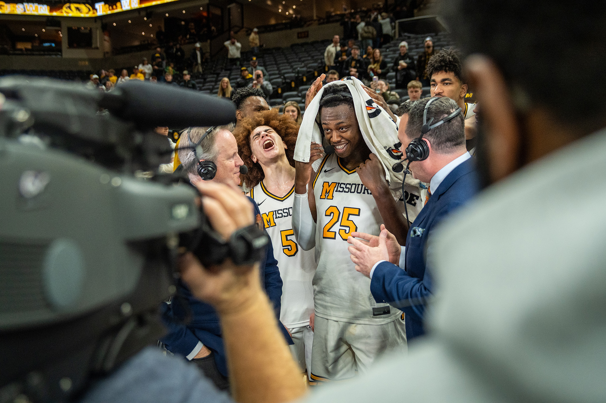 This photo is the aftermath of the game as ESPN reporters gathered around Mitchell to ask him about his game-winning shot while teammate T.O. Barrett (#5) amped him up.