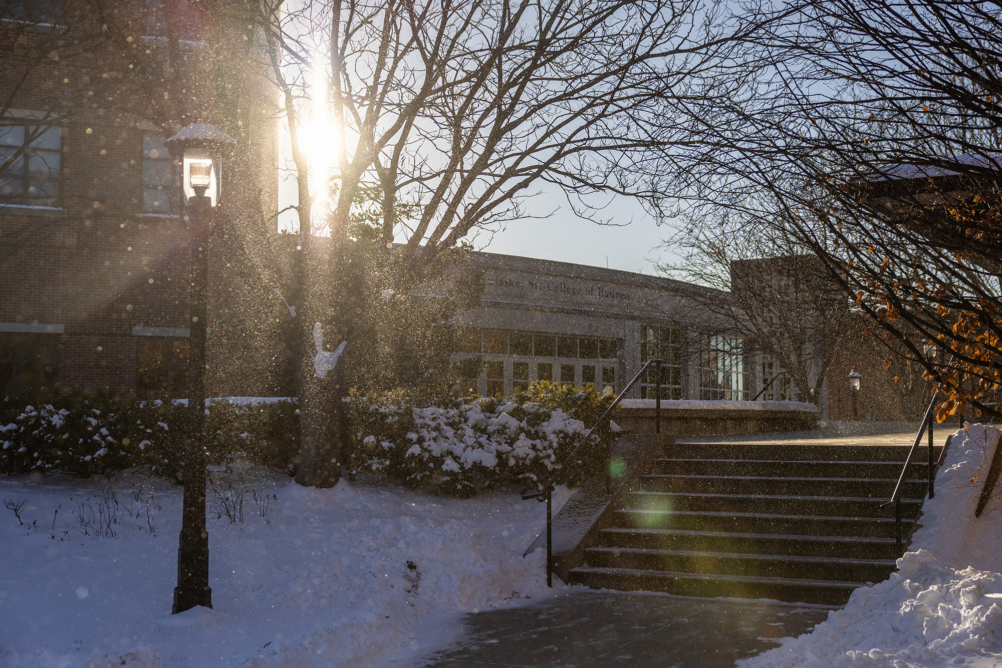 This was a case of just being in the right place at the right time. On the Monday after the snowstorm, I was simply walking around campus capturing what I could. As I was about to pass Cornell Hall, the late afternoon sun was shining above the building. The wind began to pick up, blowing the soft powder off the roof. The sun caught the crystals and created a natural snow globe around me.